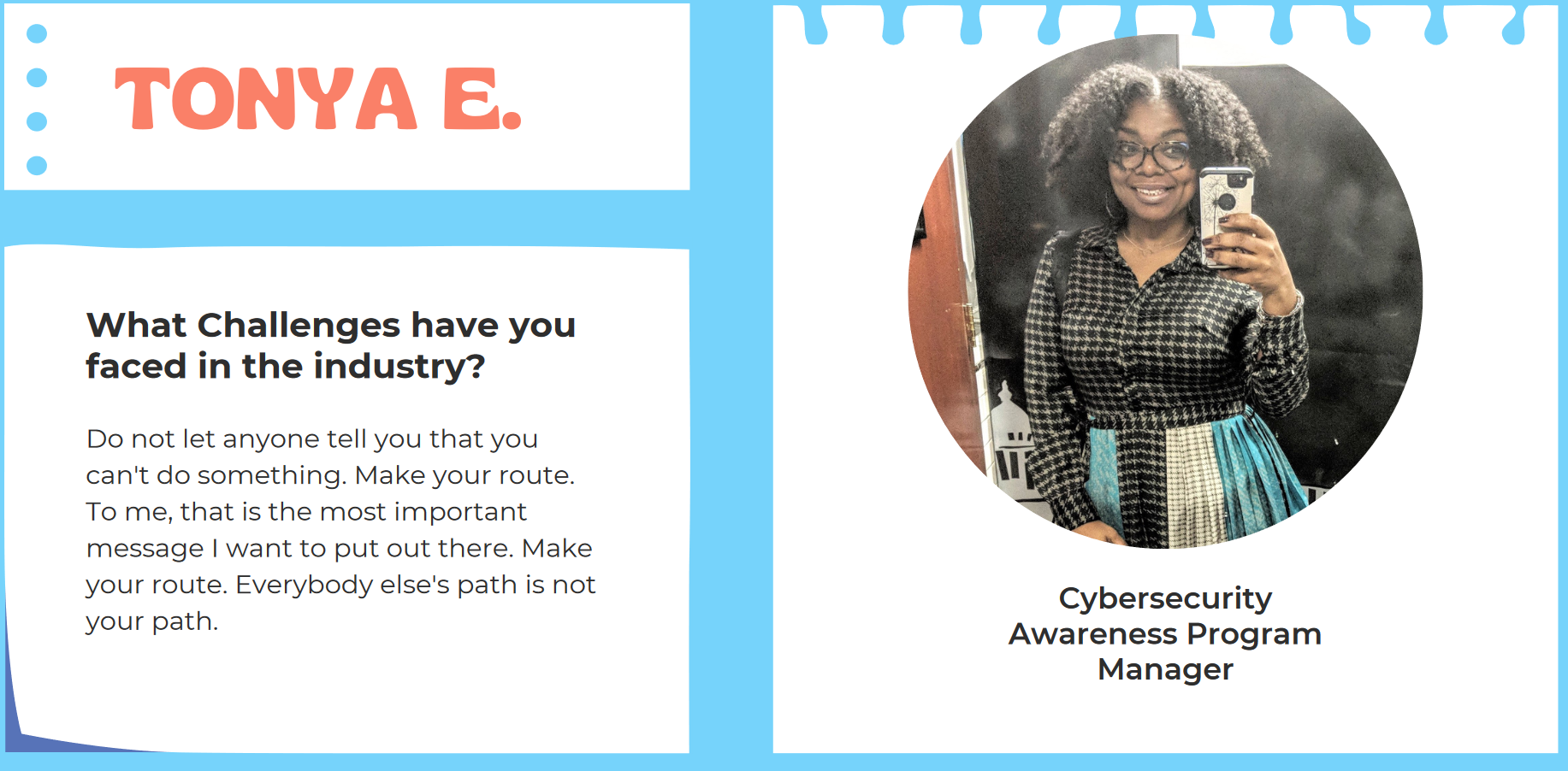 "The thing that I would say the most, and that's probably one of the few things that separates me; I don't have anything beyond a high school education. I went to a two year college for liberal arts. Didn't finish. And I don't have any certifications. And that's one good thing about the IT community, you don't have to. You have people like me, I'm 43 years old and I have a high school diploma. However, I'm making six figures. People who look like me, older black women would say, "oh, no, you need to be in school for this before you can qualify to do this." But then I'd have somebody else tell me, "you don't have to do any of that." Make your own route. To me, that is the most important message I want to put out there. Make your own route. Everybody else's path is not your path. Now, would I like to get a few certifications? Sure! I'm actually pursuing some now, but in the meantime, make your route. So the biggest thing is overcoming people thinking that, oh, I can't do it, or it's too late in life for me to start over, or I don't have enough experience. That's not true. First of all, with a whole bunch of favor, a whole bunch of God, and treating people the way you want to be treated, you can go really far by making your own route without having to do the traditional way."