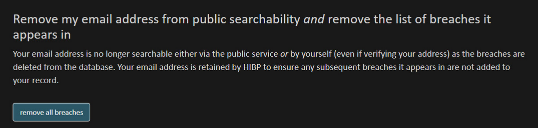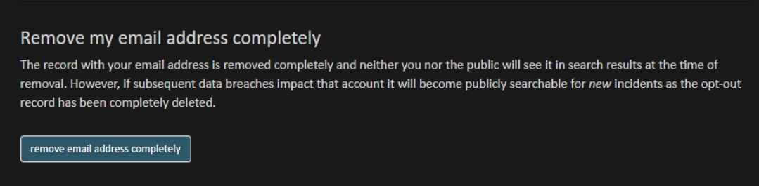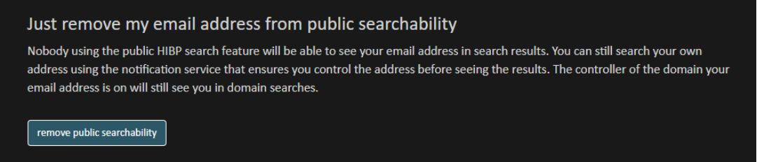 Remove from Public Searchability and List of Breaches: Your email becomes a digital ghost – invisible to public searches and vanishing from the latest breach lists. But it's not gone forever; HaveIBeenPwned.com keeps an eye out for future breaches.